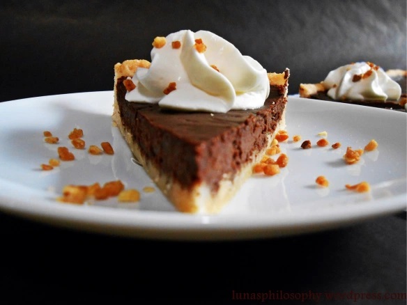 Schokomasse auf den vorgebackenen Boden gießen. Ofentemperatur auf 150°C herunterschalten und die Tarte für ca. 20 Minuten backen. Aus dem Ofen holen und in der Form auskühlen lassen. Danach die Tarte vorsichtig aus der Form lösen und in Stücke schneiden.