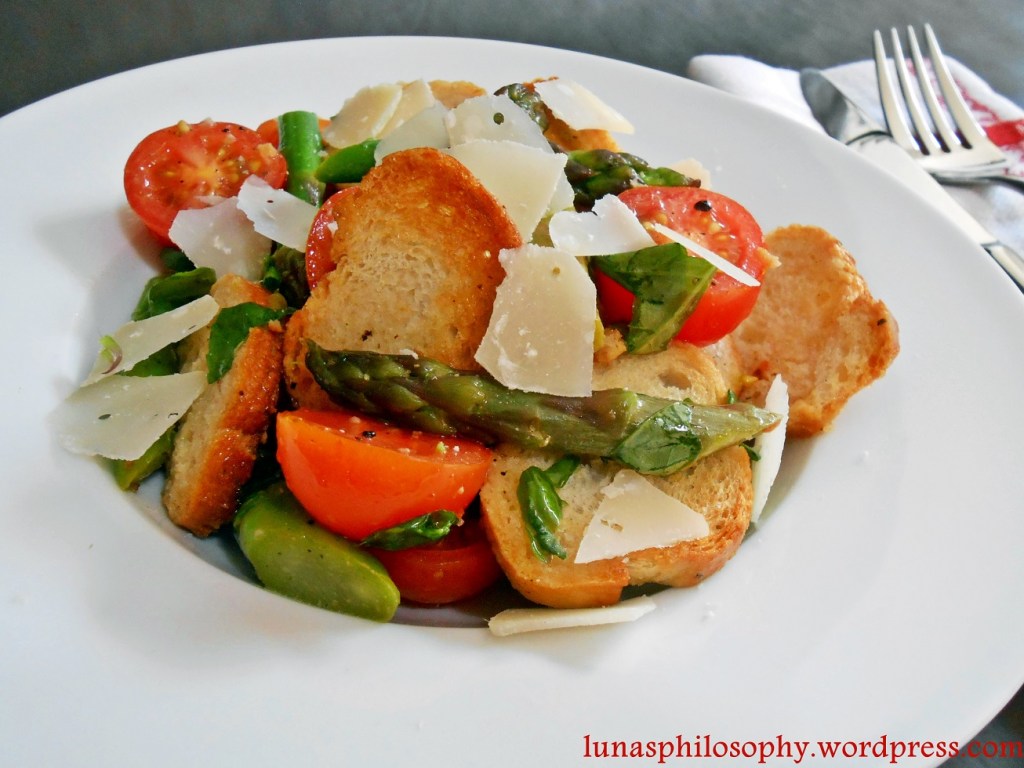 Brotsalat auf Tellern anrichten und mit gehobeltem Parmesan bestreuen.